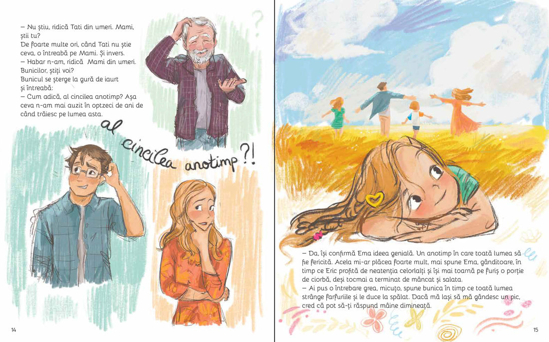 De data asta nu explorează România cu autorulota, nici nu învață regulile de circulație, nici nu gătesc alături de părinții lor. În această nouă carte, Ema și Eric inventează al cincilea anotimp, unul care vine des și pleacă repede, dar aduce cu el multă bucurie și acceptare.