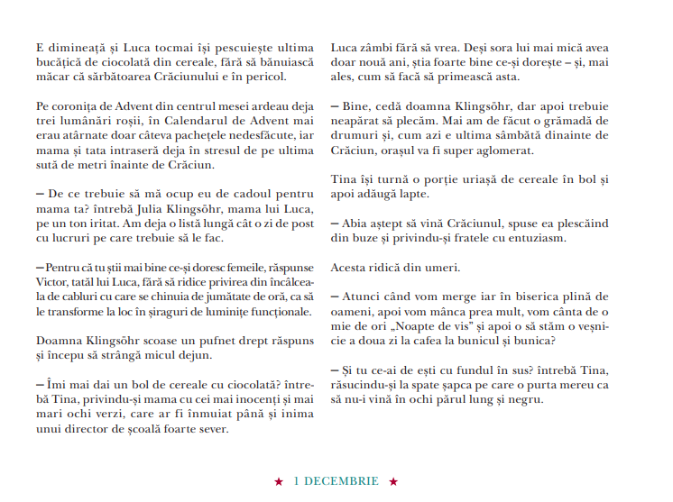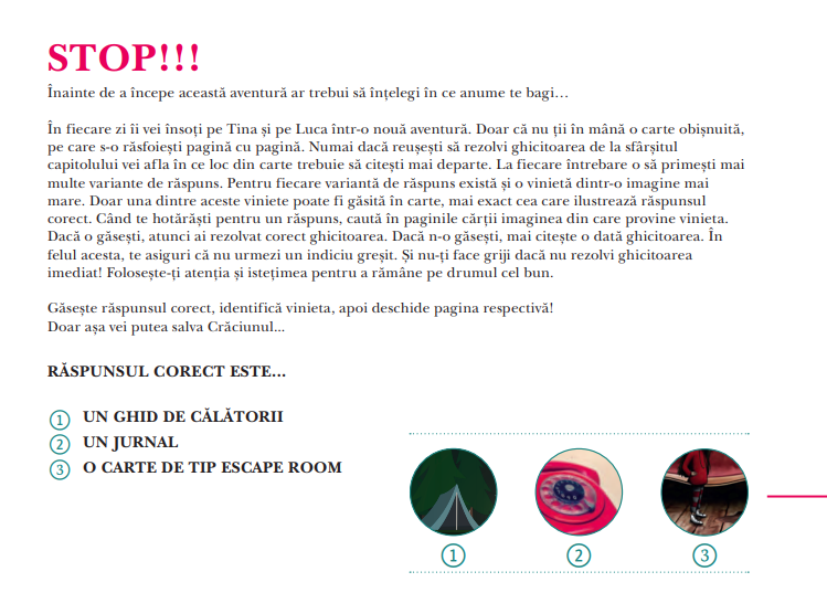 Nu doar o carte – joc de evadare, ci o călătorie interactivă plină de mister și bucurie, special concepută pentru copii și întreaga familie. O carte – Calendar de Advent, care devine un calendar de aventură de parcurs în serile lungi de iarnă, în așteptarea Crăciunului.