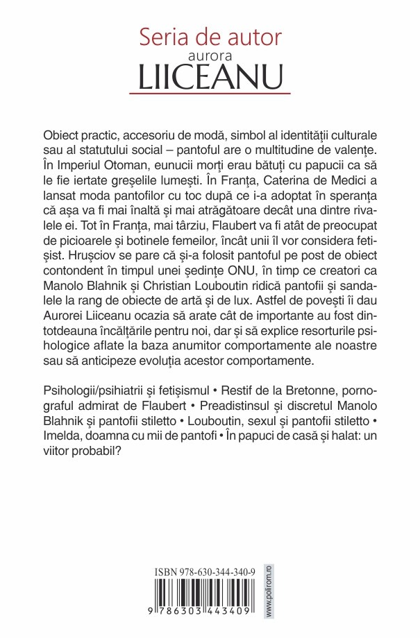Obiect practic, accesoriu de modă, simbol al identității culturale sau al statutului social – pantoful are o multitudine de valențe. În Imperiul Otoman, eunucii morți erau bătuți cu papucii ca să le fie iertate greșelile lumești. În Franța, Caterina de Medici a lansat moda pantofilor cu toc după ce i-a adoptat în speranța că așa va fi mai înaltă și mai atrăgătoare decât una dintre rivalele ei. Tot în Franța, mai târziu, Flaubert va fi atât de preocupat de picioarele și botinele femeilor, încât unii îl vor considera fetișist. Hrușciov se pare că și-a folosit pantoful pe post de obiect contondent în timpul unei ședințe ONU, în timp ce creatori ca Manolo Blahnik și Christian Louboutin ridică pantofii și sandalele la rang de obiecte de artă și de lux. Astfel de povești îi dau Aurorei Liiceanu ocazia să arate cât de importante au fost dintotdeauna încălțările pentru noi, dar și să explice resorturile psihologice aflate la baza anumitor comportamente ale noastre sau să anticipeze evoluția acestor comportamente.