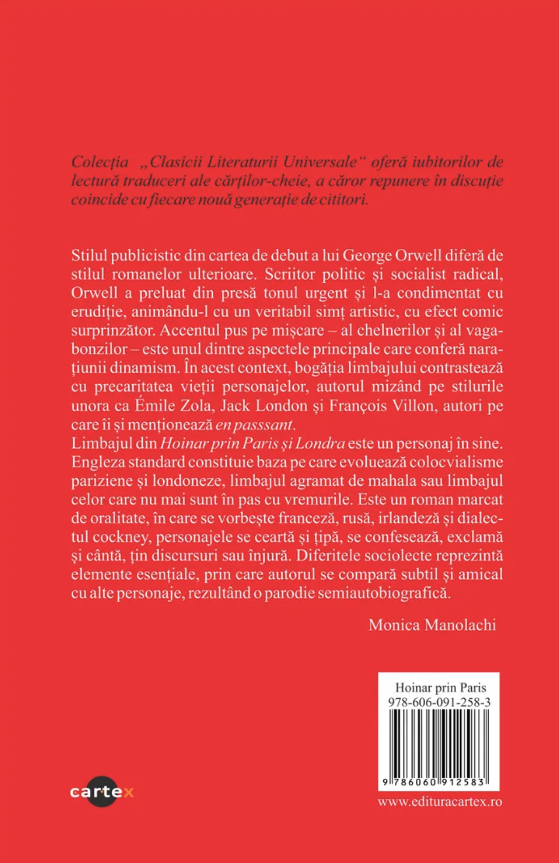 Stilul publicistic din cartea de debut a lui George Orwell difera de stilul romanelor ulterioare. Scriitor politic si socialist radical, Orwell a preluat din presa tonul urgent si l-a condimentat cu eruditie, animandu-l cu un veritabil stil artistic, cu efect comic surprinzator. Accentul pus pe miscare – al chelnerilor si al vagabonzilor – este unul dintre aspectele principale care confera naratiunii dinamism. In acest context, bogatia limbajului contrasteaza cu precaritatea vietii personajelor, autorul mizand pe stilurile unora ca Emile Zola, Jack London si Francois Villon, autori pe care ii si mentioneaza en passant. -- Monica Manolachi