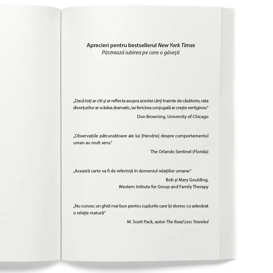 „Păstrează iubirea pe care o găsești este o carte despre iubirea care nu se sprijină pe noroc, ci pe grijă și competență relațională. Harville Hendrix și Helen LaKelly Hunt ne arată, cu claritate și blândețe, că relațiile nu se pierd din lipsă de sentimente, ci din lipsă de siguranță și prezență. O lectură practică și profund umană, pentru cei care își doresc să construiască o relație matură și să o păstreze vie, zi după zi.“