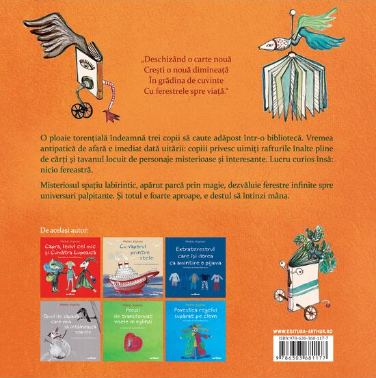 O ploaie torențială îndeamnă trei copii să caute adăpost într-o bibliotecă. Vremea antipatică de afară e imediat dată uitării: copiii privesc uimiți rafturile înalte pline de cărți și tavanul locuit de personaje misterioase și interesante. Lucru curios însă: nicio fereastră.