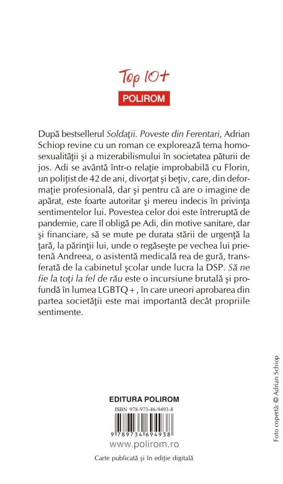 După bestsellerul Soldaţii. Poveste din Ferentari, Adrian Schiop revine cu un roman ce explorează tema homosexualităţii şi a mizerabilismului în societatea păturii de jos.