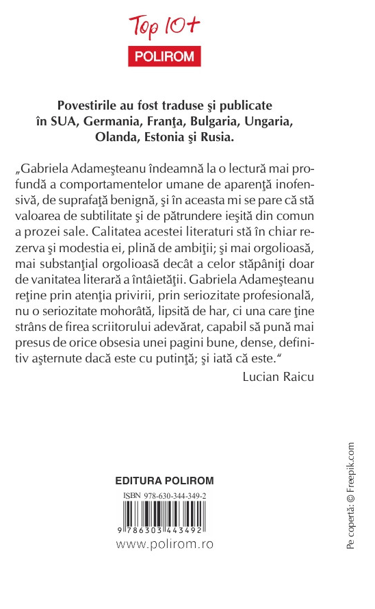 „Gabriela Adameşteanu îndeamnă la o lectură mai profundă a comportamentelor umane de aparenţă inofensivă, de suprafaţă benignă, şi în aceasta mi se pare că stă valoarea de subtilitate şi de pătrundere ieşită din comun a prozei sale. Calitatea acestei literaturi stă în chiar rezerva şi modestia ei, plină de ambiţii; şi mai orgolioasă, mai substanţial orgolioasă decât a celor stăpâniţi doar de vanitatea literară a întâietăţii. Gabriela Adameşteanu reţine prin atenţia privirii, prin seriozitate profesională, nu o seriozitate mohorâtă, lipsită de har, ci una care ţine strâns de firea scriitorului adevărat, capabil să pună mai presus de orice obsesia unei pagini bune, dense, definitiv aşternute dacă este cu putinţă; şi iată că este.” (Lucian Raicu)