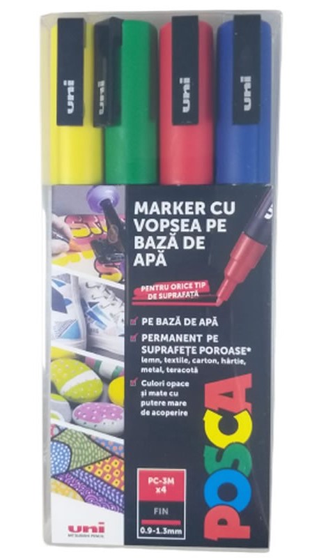 Set de 4 markere care scriu pe majoritatea suprafețelor: hârtie, metal, plastic, sticlă, piatră, pânză și țesătură, iar vopseaua este pe bază de apă, nu are miros și nu este toxică.
