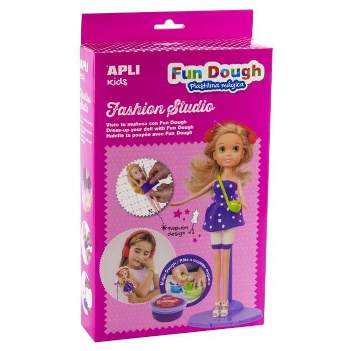 Învață-ți copilul să confecționeze haine pentru păpuși din plastilină cu ajutorul acestui mic kitt de croitorie. Setul include un manechin.