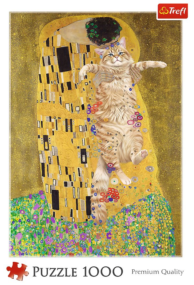 Puzzle-ul Purrfect Kiss, format din 1.000 de piese, prezintă o interpretare jucăușă și felină a celebrului tablou „Sărutul” de Gustav Klimt. Odată asamblat, puzzle-ul va crea o imagine de 683x480 mm.